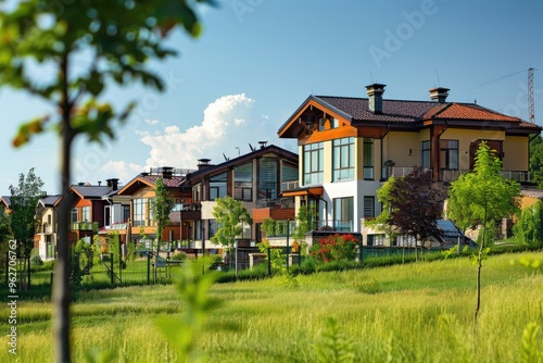 A perfect neighbourhood, houses in suburb at summer, luxury houses with nice landscape.