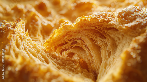 A perfectly baked croissant, split open to reveal its flaky layers. The focus is on the delicate texture and the way light beautifully catches the golden edges, emphasizing its crisp, airy layers.