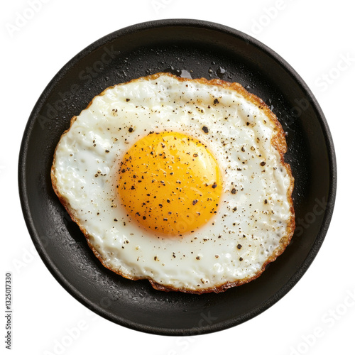 A perfectly cooked fried egg with a bright yellow yolk surrounded by a white, lightly seasoned with pepper.