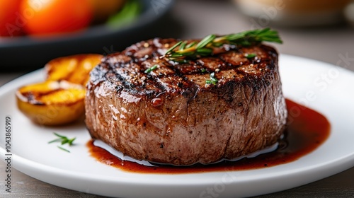 A perfectly cooked juicy steak, resting in a splash of rich sauce, is elegantly presented on a plate, making it a visual and gastronomic delight for the senses.