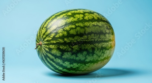 A perfectly ripe whole watermelon on a vibrant, solid blue background.