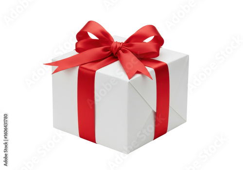 A perfectly square gift box, luxurious crisp white matte wrapping, deep vibrant red satin bow elegantly tied, isolated on a pure transparent studio background, diffused bright even light with no