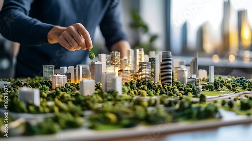 A person adds a miniature tree to a detailed model of a modern city with lush green spaces, showcasing sustainable urban development and eco-friendly architecture.