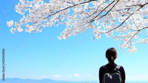 A person admires blooming cherry blossoms under a blue sky, evoking tranquility.