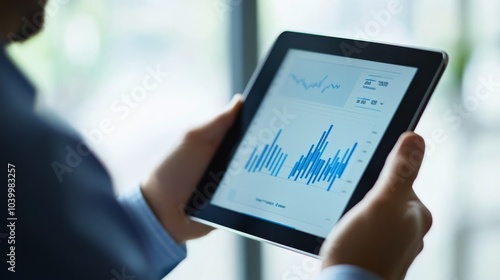 A person analyzing data on a tablet, showcasing a visual graph with fluctuating statistics in a modern workspace.