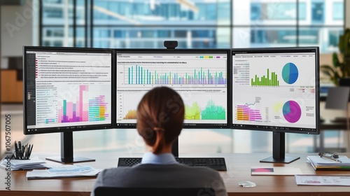 A person analyzing data on multiple computer screens in a modern office environment.