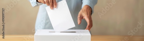 A person casting a vote by placing a ballot into a voting box during an election or poll, exercising their democratic rights.