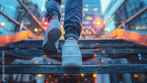 a person clad in casual wear, climbing the stairs within a corporate city setting, evoking the steady pace of career advancement.