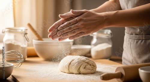 A person clapping their hands in a kitchen, with flour and dough visible on the counter.