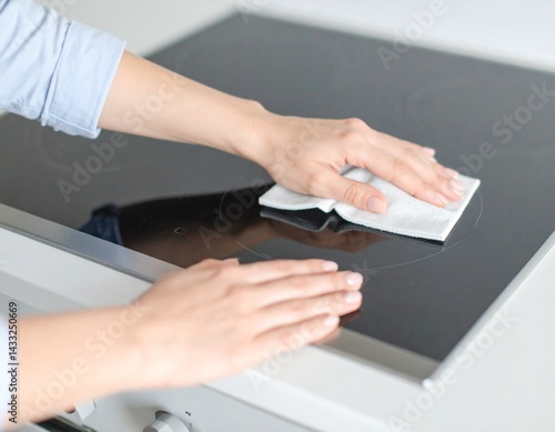 A person cleans a glossy stovetop with a cloth, showcasing a commitment to cleanliness and home maintenance.