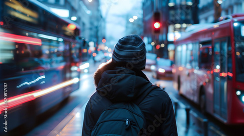 A person commuting to work or school in a bustling cityscape