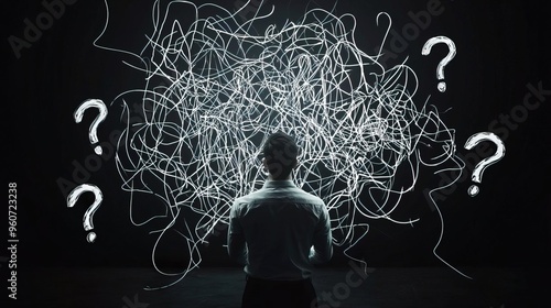 A person contemplates a chaotic mess of lines, symbolizing confusion and uncertainty in thought and decision-making.