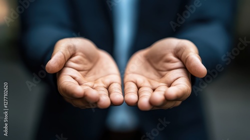 A person displays their hands outward, emphasizing their features and gestures in a confident manner, inviting attention and engagement.