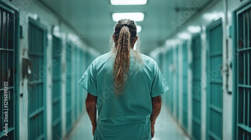 A person dressed in prison scrubs stands in a dimly lit corridor, capturing a gritty moment of life behind bars that reflects challenges of human resilience and survival.