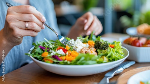 A person enjoys a fresh, vibrant salad topped with colorful vegetables, capturing the essence of healthy eating and well-being in a bright, natural setting.