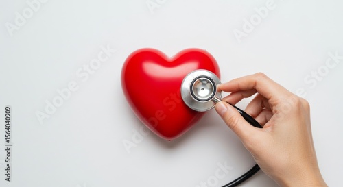 A person examines a red heart with a stethoscope, a symbol of health and wellness.