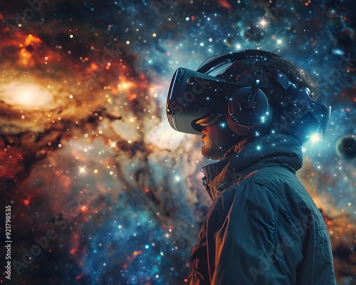 A person exploring a detailed outer space simulation with VR headset stars and galaxies in the background