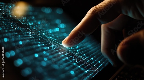 A person finger gently touches a laptop screen displaying a web of interconnected dots, representing the exploration