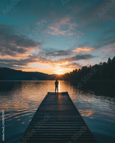 A person fishing at the edge of a dock during sunset, with ripples in the water and a serene atmosphere, styled warmly