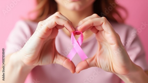 A person forms a heart shape with their hands, showcasing a pink ribbon between their fingers