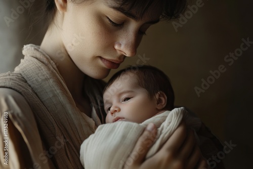 A person gazes lovingly at their newborn, creating a warm connection in a peaceful, simple atmosphere