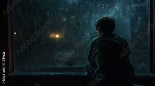 A person gazes out a window into a rainy night, illuminated by dim lights, evoking a sense of solitude and contemplation.