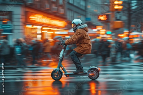 A person glides effortlessly on their segway scooter, the wet street reflecting the city lights as their tires spin on the slick pavement