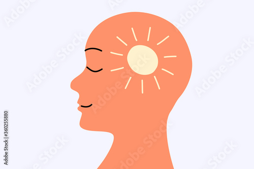 A person having a little glowing sun in his head. Mentally healthy and happy person concept. Human head flat design .