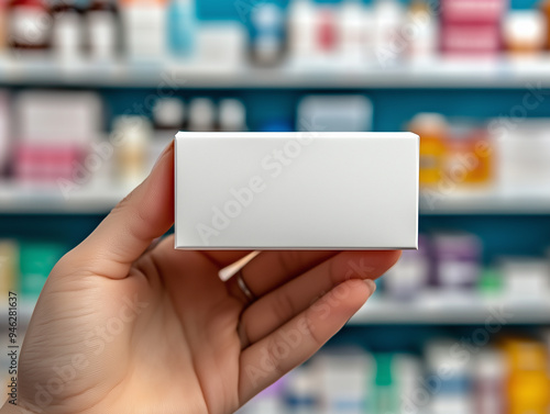 A person holding a blank product box in a pharmacy during daylight with shelves lined with various medications and health products in the background