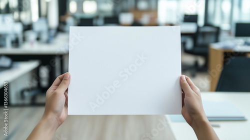 A person holding a blank sheet of paper in an office setting, ready for use or presentation.