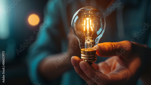 A person holding a bright, glowing lightbulb in their hand, emitting warm light against a dim background, symbolizing innovation and ideas.