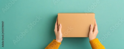 A person holding a brown cardboard box against a teal background, symbolizing delivery, packaging, or online shopping.