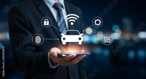 A person holding a phone with a holographic projection of a car and connected icons.