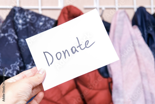 A person holding a piece of paper that says Donate in front of a rack of cloth