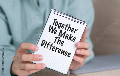 A person holding a spiral bound notebook with the words Together We Make the Difference written on it