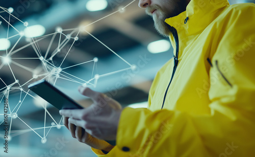 A person holding a tablet surrounded by glowing blue network connections, symbolizing technology and digital connectivity.