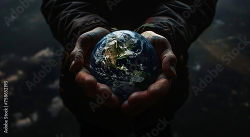 A person holding planet Earth with a glowing light, in the style of a business concept of a global world and environment protection for climate change day or Earth Day background