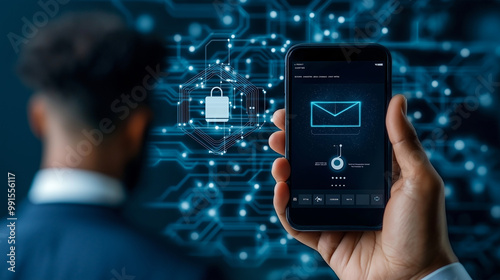 A person holding smartphone displaying secure email interface, surrounded by digital technology elements. image conveys sense of modern communication and cybersecurity