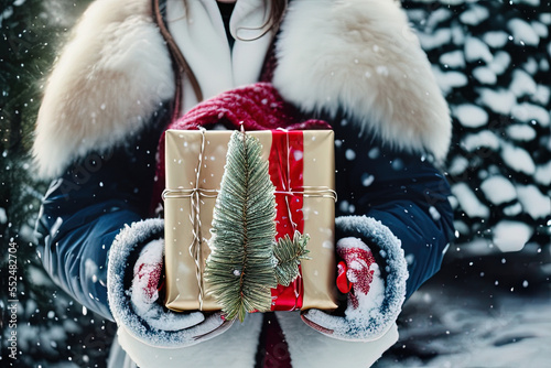 a person holding two wrapped presents in their hands in the snow - Gift packaging - AI Generated