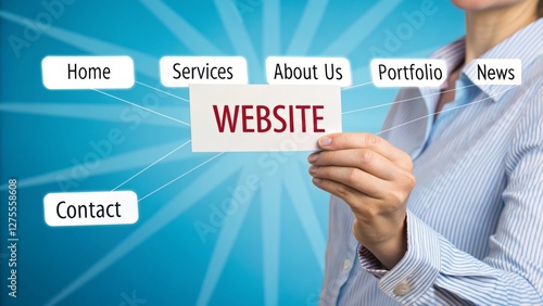 A person holds a card labeled "WEBSITE" surrounded by menu options like Home, Services, and Contact, set against a bright blue background.
