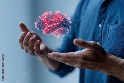 A person holds a glowing, digital representation of a brain, symbolizing creativity, intelligence, and the power of the mind.