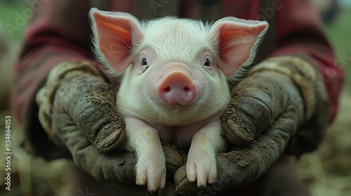 A person holds a small piglet in their gloved hands, showcasing animal care and farming.