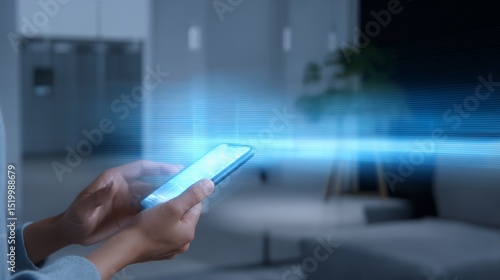 A person holds a smartphone in a modern home environment. The phone emits a soft blue glow, suggesting advanced technology. This image conveys innovation and connectivity. AI
