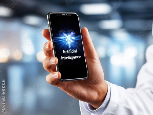 A person holds a smartphone showing an image representing artificial intelligence. The background features a modern, high-tech environment with soft lighting.