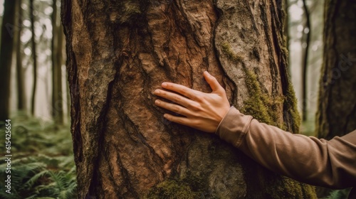 A person hugging a tree in a forest