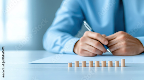 A person in a blue shirt writes on paper, with a row of wooden blocks arranged in front, suggesting focus on organization or strategy.