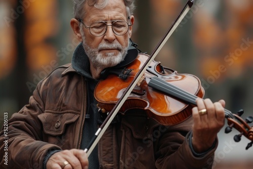 A person in a brown jacket masterfully plays a classic violin on the street, capturing the art of music