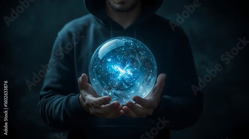 A person in a dark hoodie holds a glowing crystal ball filled with blue particles and light orbs, highlighting a mystical, futuristic atmosphere in a dark, moody scene.