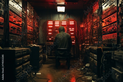 a person in a dark room controls computer devices for computing and information processing, video surveillance and hacking