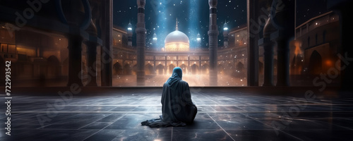 A person in a hooded robe meditating in a palace courtyard with a majestic view. Fictional character created by Generative AI.
